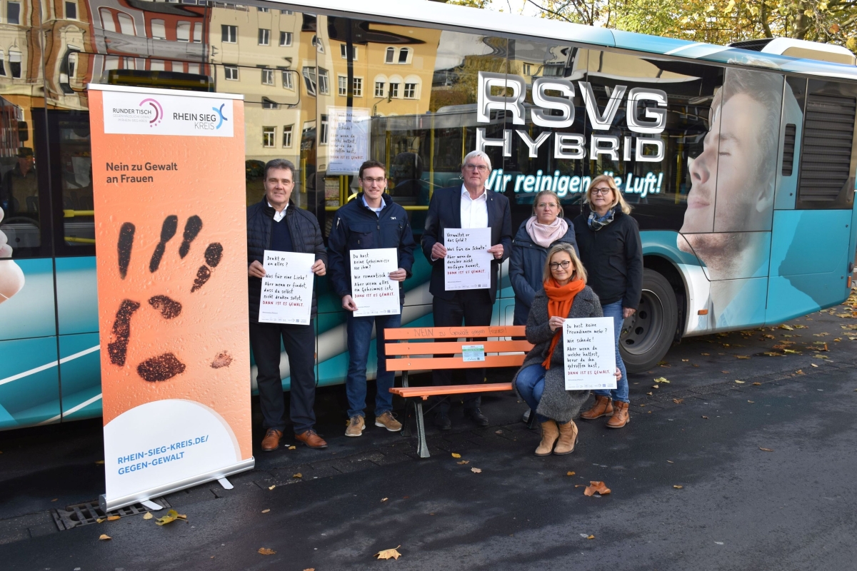 „Wo fängt Gewalt in Beziehungen an? Darüber klären wir mit unserer Aktion auf. Ich bin sehr froh, dass der Kreis für dieses Thema, das mir sehr am Herzen liegt, so viele wichtige und einflussreiche Akteure ins Boot holen konnte“, sagte Landrat Sebastian bei der Präsentation am Siegburger Busbahnhof. „Ziel ist es, über häusliche Gewalt aufzuklären und möglichst viele Menschen – Betroffene, aber auch ihr Umfeld - auf diesem Wege, zu erreichen“, betonten, Dr. Marcel Frank, Geschäftsführer der RVK und Volker Otto, Geschäftsführer der RSVG.